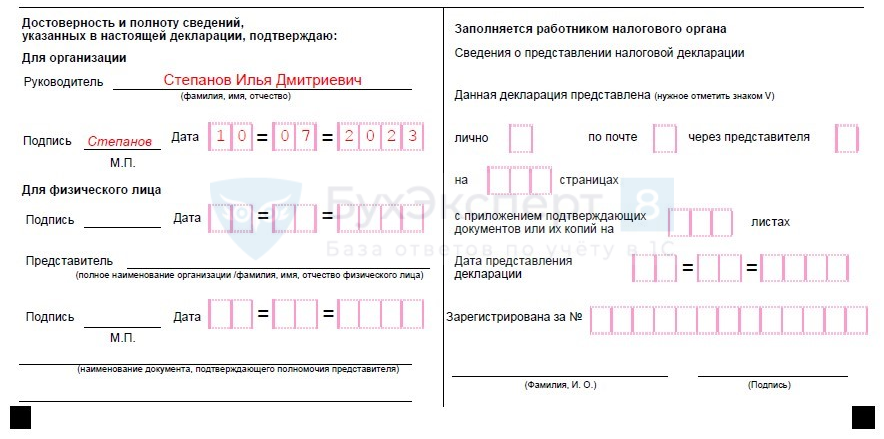 - При представлении Декларации налогоплательщиком-организацией в поле «фамилия, имя, отчество полностью» — построчно полностью фамилия, имя, отчество руководителя организации. Проставляется личная подпись руководителя организации и дата подписания.