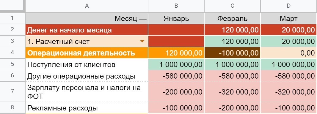 Например, в начале месяца прикинули на салфетке расходы на бизнес и решили увеличить рекламный бюджет. В этом месяце денег хватило на все, а вот в следующем нет. Оказалось, что потраченные на рекламу дополнительные деньги были нужны для оплаты трех новых сотрудников, нанятых в конце месяца.