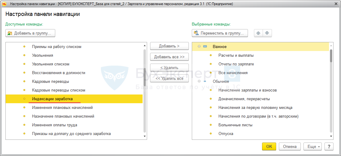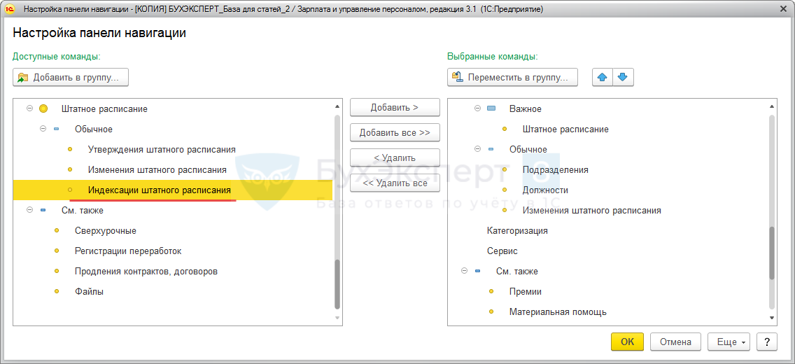 В открывшейся форме в левой таблице найдите документ Индексация заработка и добавьте его в интерфейс также, как документ Индексация штатного расписания :
