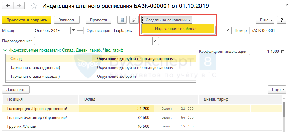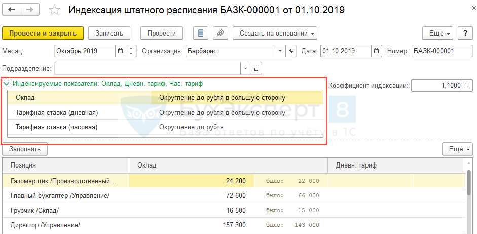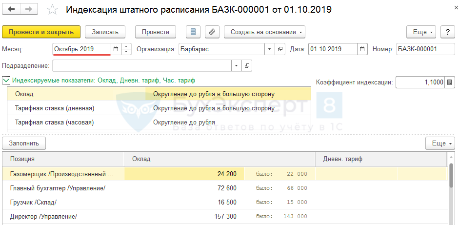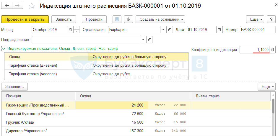 Для того, чтобы провести индексацию штатного расписания и заработка в 1С 8.3 ЗУП заполните поле Коэффициент индексации :