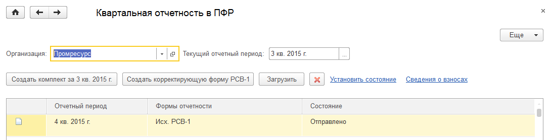 Отчетные документы формируются на рабочем месте «Квартальная отчетность в ПФР». Инструмент позволяет отразить всю последовательность действий, связанных с отправкой отчетности, начиная с автоматического формирования документации и заканчивая проверкой данных и отправкой в территориальный орган ПФР с применением «1С-Отчетность».