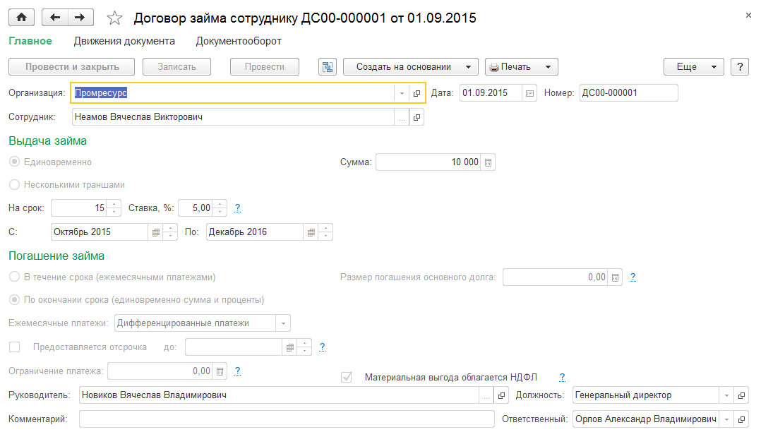 Сумма начисленных платежей за пользование наемными средствами, а также суммы в счет погашения процентов и основного долга, материальная выгода и соответствующий ей НДФЛ рассчитываются в автоматическом режиме.