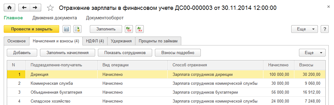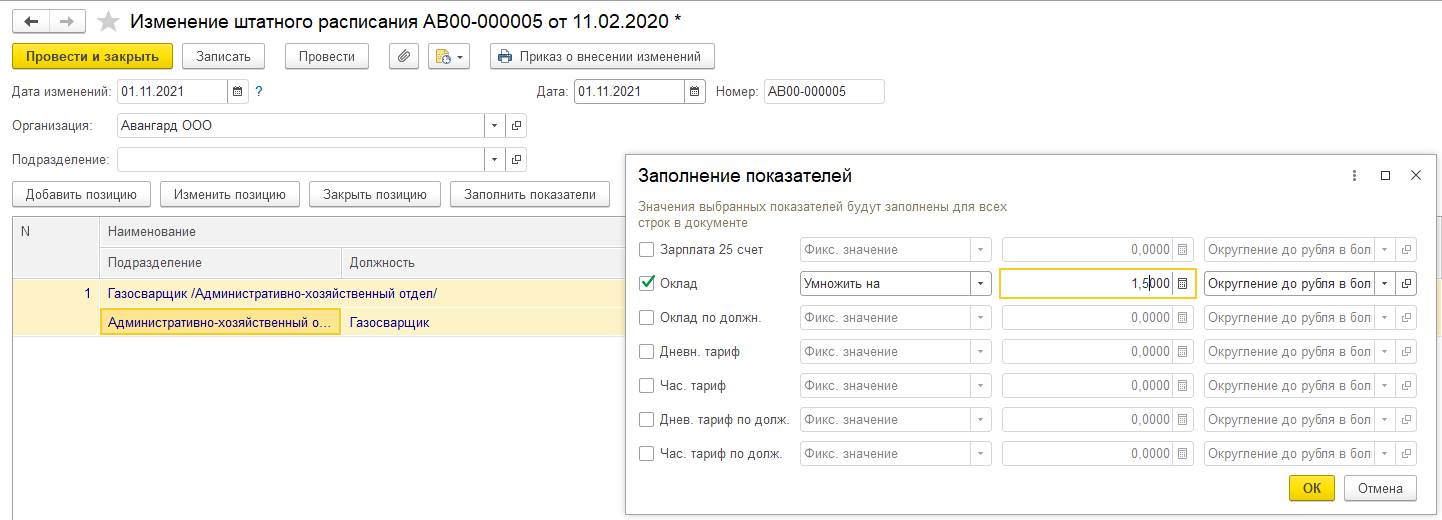 Позицию сохраняем по кнопке «ОК», после чего она встает в строчку нашего документа «Утверждение штатного расписания». Когда все позиции будут занесены, документ необходимо провести — это можно сделать с помощью кнопок «Провести» или «Провести и закрыть».