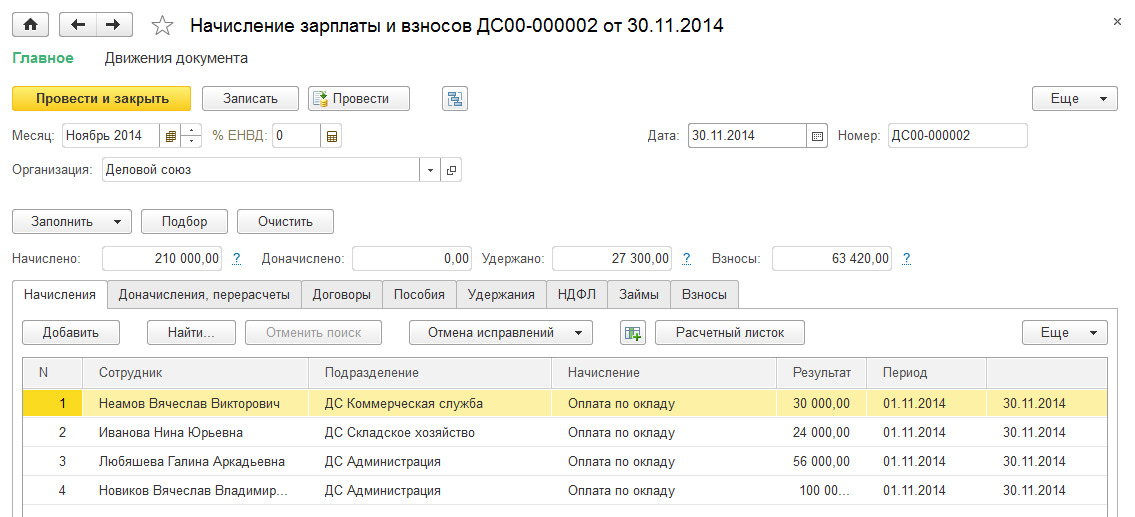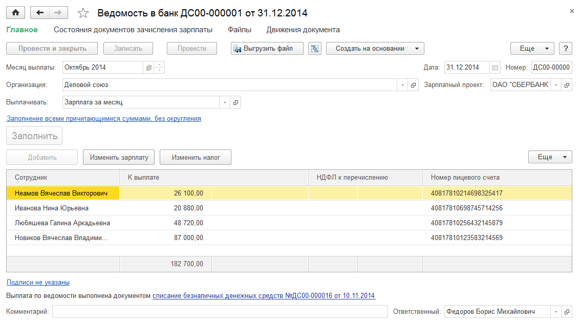 С учетом различных начислений и удержаний формируется причитающаяся к выплате сумма. В прикладном решении можно приготовить зарплатные ведомости для выплаты этих денег. Для этого автоматически заполняются списки сотрудников предприятия и формируются соответствующие печатные документы.