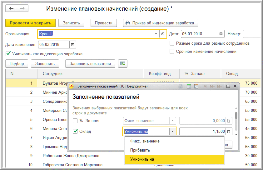 В поле Коэффициент индексации укажите значение – 1,10 (индексация на 10%):