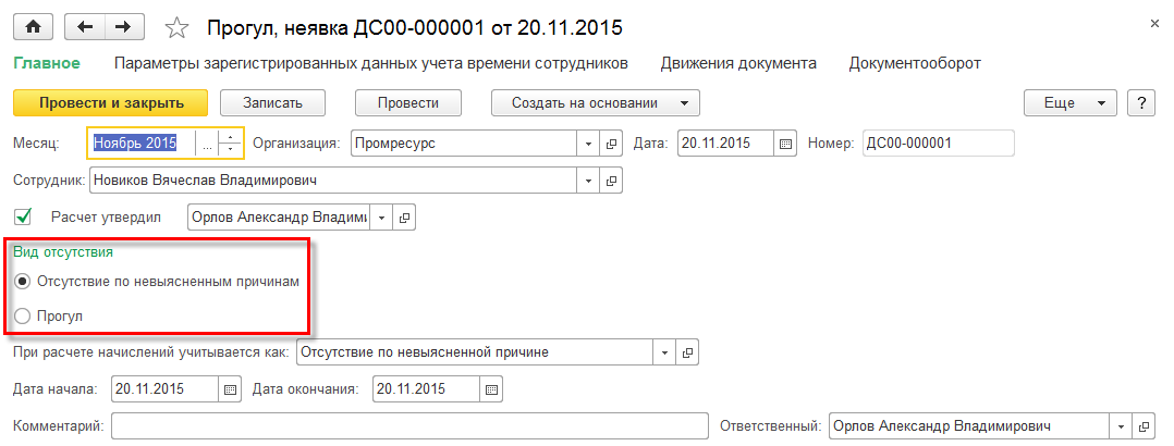 Факты отсутствия сотрудников на работе могут отражаться с помощью различных операций: