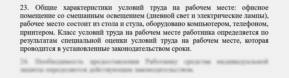 «Общие характеристики условий труда на рабочем месте: ______________ (общее описание, используемое оборудование и особенности работы с ним). Класс условий труда на рабочем месте работника определяется по результатам специальной оценки условий труда на рабочем месте, которая проводится в установленные законодательством сроки».