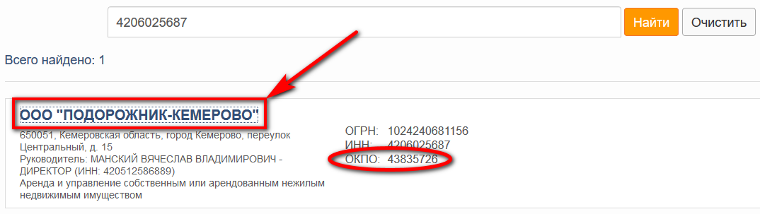 - Заполнить одно из ниже представленных полей – ОКПО, ИНН или ОГРН;