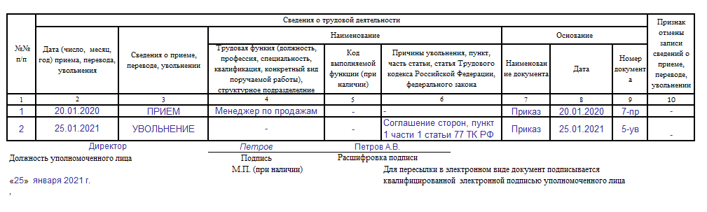 Если документ оформляется в бумажном виде, то проставляются дата заполнения документа, а также должность, подпись и ее расшифровка уполномоченного лица (обычно руководитель работодателя). Ставится печать (если есть).