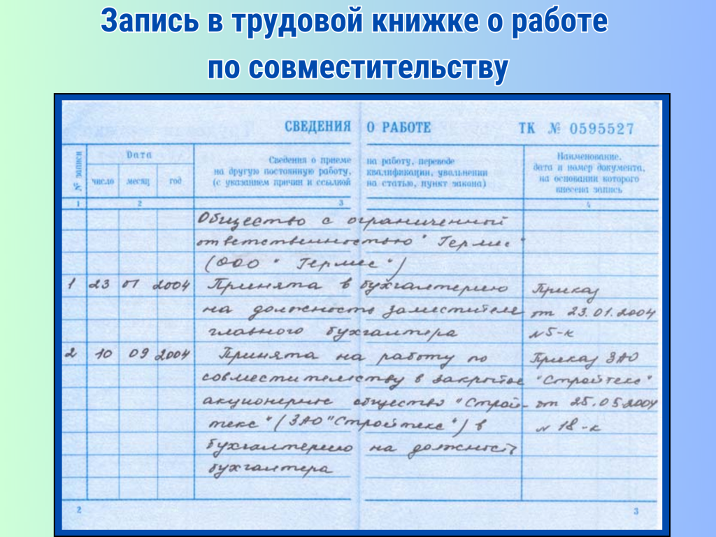 В случае верного заполнения всех вышеуказанных документов, специалист кадровой службы обязан внести информацию о работе по совместительству в трудовую книжку работника.