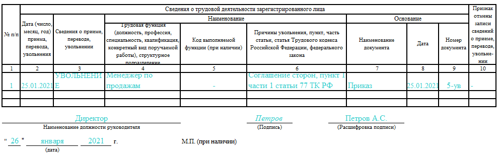 - в столбце 6 — причина увольнения, в т. ч. пункт, часть статьи, статья ТК РФ;