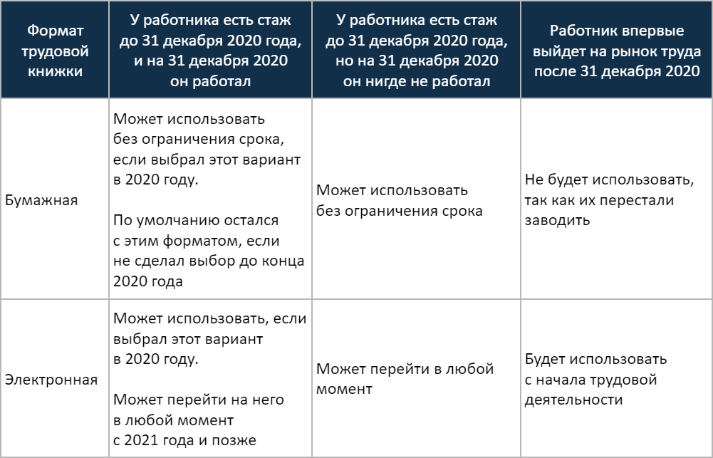 Сотрудники, которые впервые выйдут на рынок труда в 2021 году или позднее, выбирать уже не смогут. С 1 января 2021 новые бумажные трудовые книжки не заводят, поэтому для таких сотрудников останется только электронный формат ().