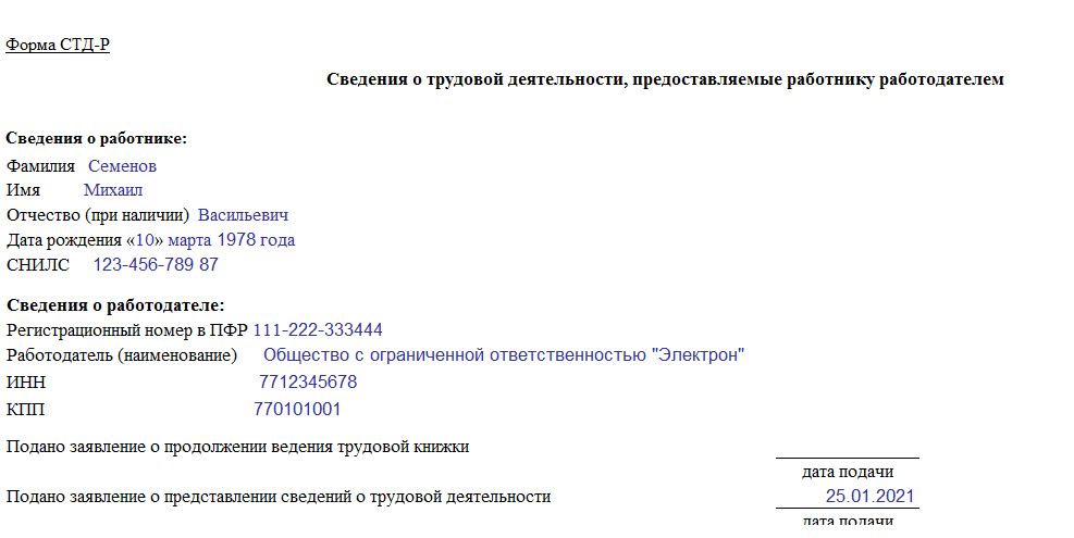 - у своего работодателя (только по периоду работы у него). Для этого нужно обратиться к нему с заявлением лично или по электронной почте, где указать, в каком виде нужны сведения: в бумажном или электронном виде. Работодатель должен предоставить их по форме СТД-Р не позднее трех рабочих дней, а при увольнении – в день увольнения.