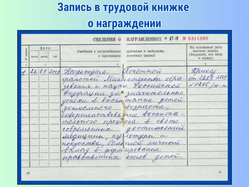 Трудовая книжка содержит раздел «Сведения о награждении». Его также обязательно нужно заполнять, если гражданин за время работы получает знаки отличия и награды. Заполнение данного раздела ведется по аналогии с разделом «Сведения о работе», только в графах 3 и 4 указывается, какой именно вид награждения и вписывается наименование приказа о нем соответственно.
