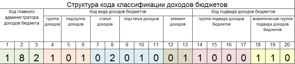 В соответствии с Приказом Минфина РФ от 01.07.2013 № 65н (с изменениями, вступившими в силу с 01.01.2018) структура кода на наглядном примере (за образец взят КБК, соответствующий НДФЛ, уплачиваемому налоговым агентом) выглядит следующим образом: