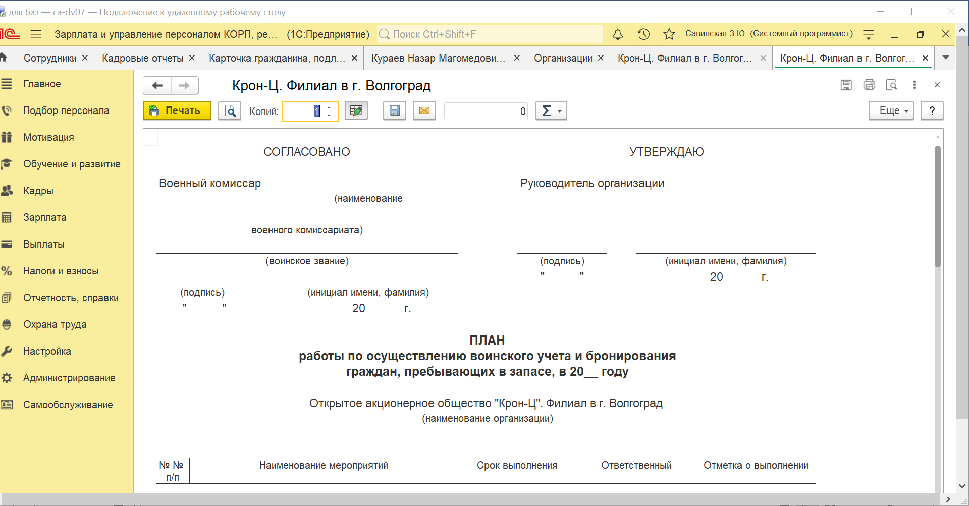 Также следует распечатать документ «План работы по осуществлению воинского учета и бронирования граждан,