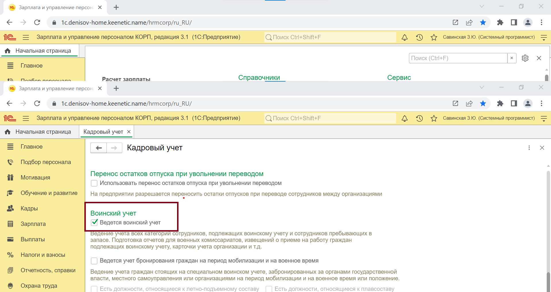 Аналогично подключению ведения воинского учета, в «1С» подключается и возможность ведения учета и
