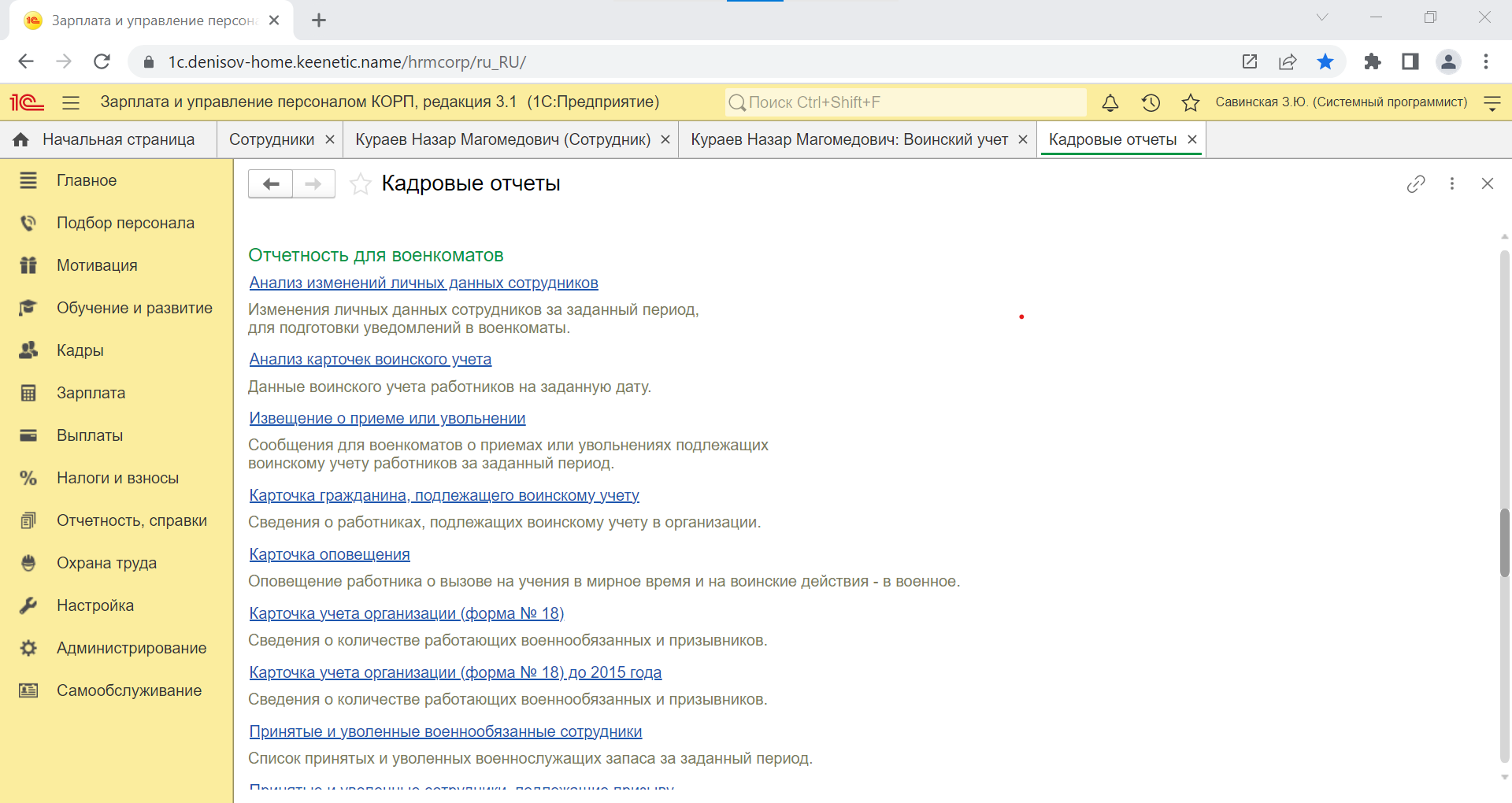 внесенных данных. Для этого перейдите на страницу «Кадры – Кадровые отчеты – Отчетность для военкоматов»
