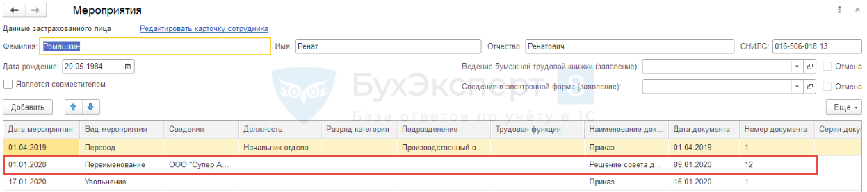 Поэтому после того, как предприятие прошло через процедуру смены официального наименования, в трудовой книжке каждого работника сотрудник отдела кадров должен указать специальной записью факт переименования и новое полное (а при необходимости – еще и сокращенное) название.