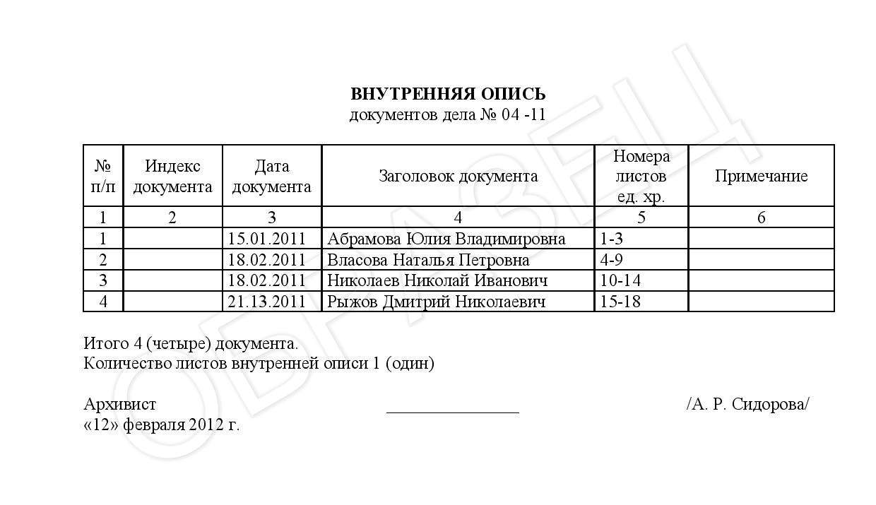 Внутренняя опись представляет собой перечень с указанием основных реквизитов бланков, входящих в папку, или личное дело работника. Эта форма используется кадровым отделом организации.
