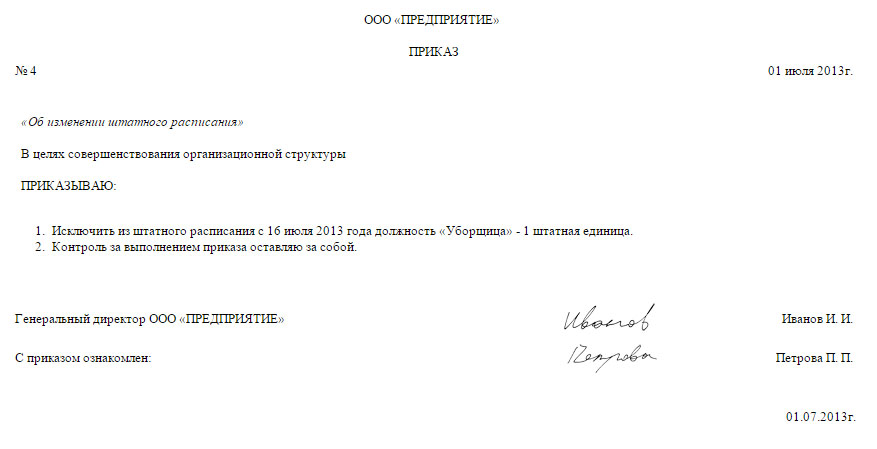 Итак, в случае необходимости убрать штатную должность, руководителем издается приказ об изменении действующего расписания, либо создании нового. Приведем порядок действий при штатных изменениях, касающихся увольнения работников: