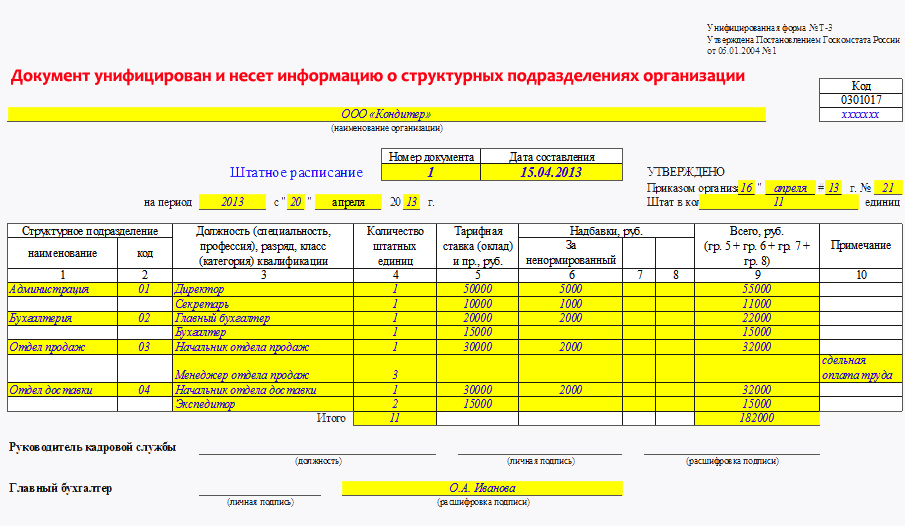 Согласно правилам, действующим относительно расписания, предусматривается возможность по замене одной должности другой. В таком случае необходимо сформировать рассматриваемую ведомость. В случае необходимости из одного подразделения изымается часть должностей и за счет них формируются новые.