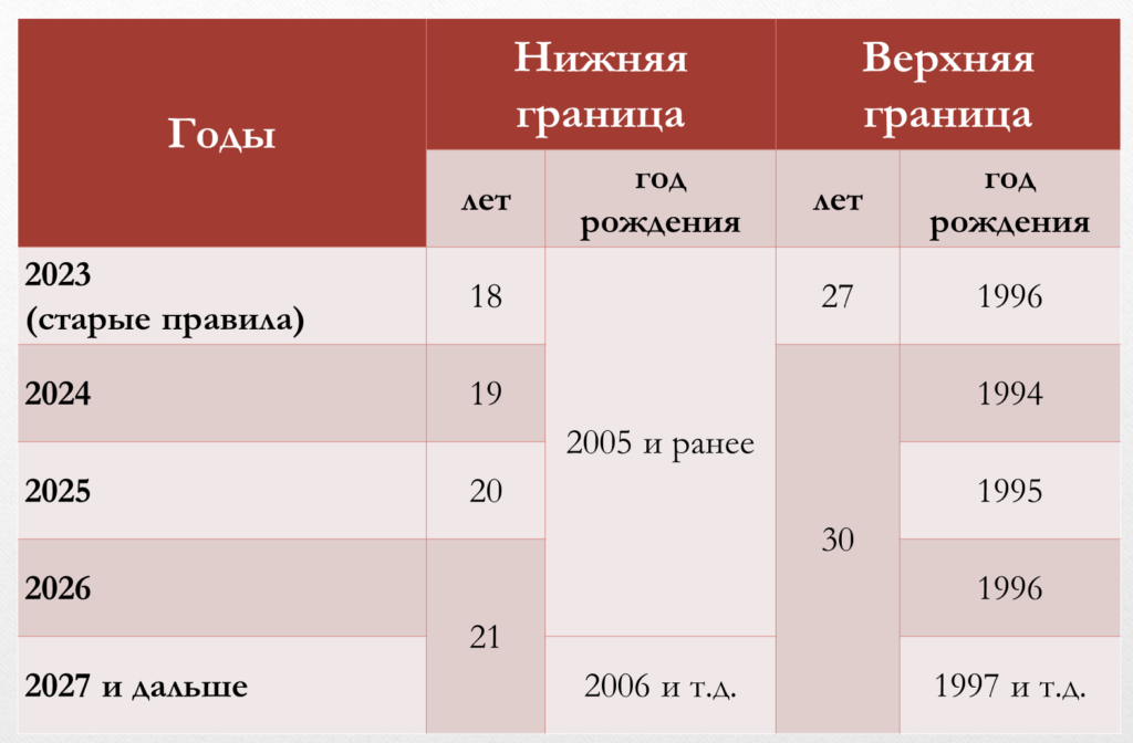 После начала действия закона (сейчас это 2024 год) верхний предел призывного возраста поднимется сразу с 27 до 30 лет.