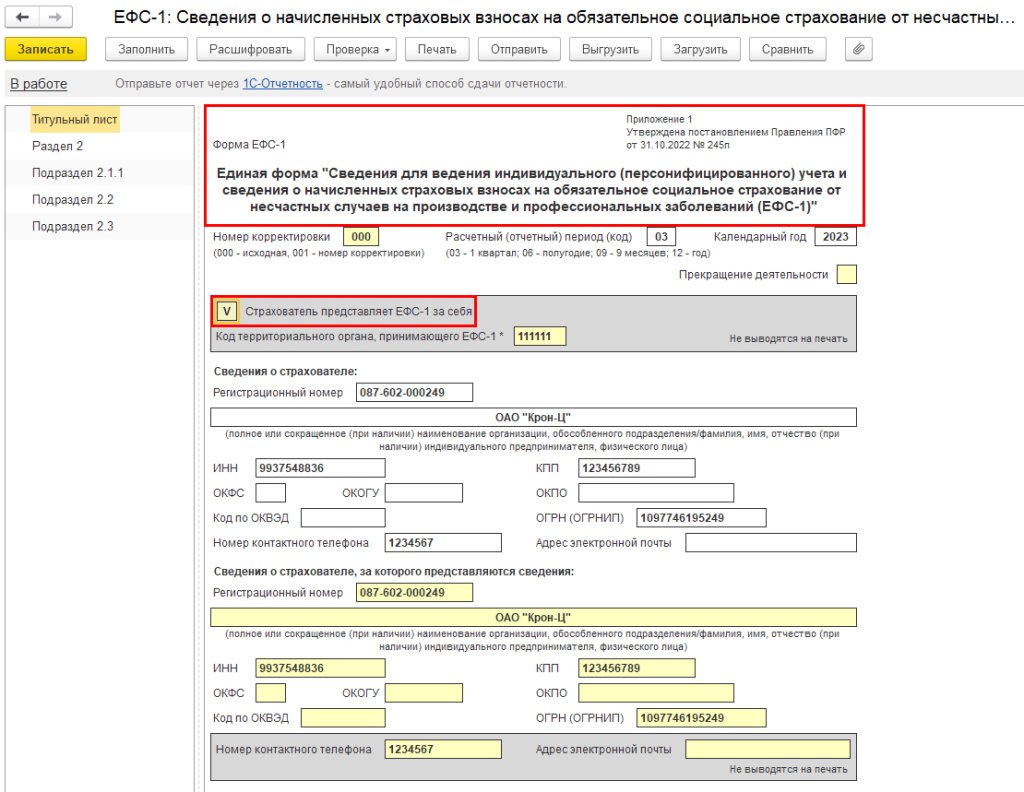 Для автоматического заполнения данных на Титульном листе необходимо установить флаг Страхователь представляет ЕФС-1 за себя (рис. 2).