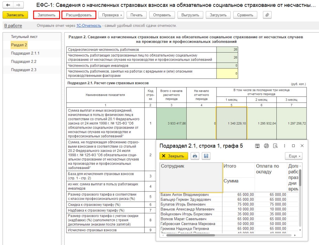 Рис. 3. Автоматическое заполнение Раздела 2 новой формы ЕФС-1 и расшифровка графы в программе «1С:Зарплата и управление персоналом 8» ред. 3