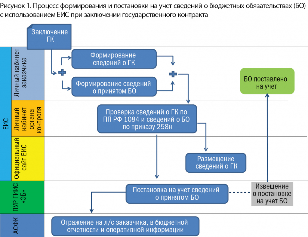 Бизнес-процесс начинается с момента размещения заказчиком в ЕИС сведений о контракте. Одновременно происходит формирование сведения о бюджетном обязательстве и его направление для постановки на учет в орган Федерального казначейства (рисунок 1).