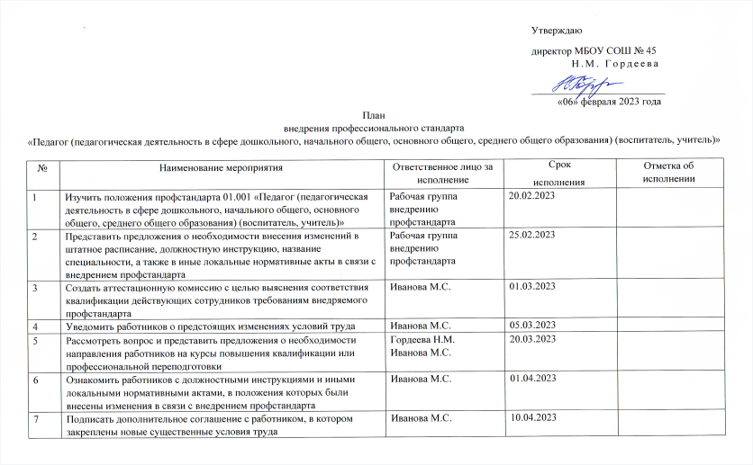 2. Разработка плана по внедрению профстандартов. Строгой формы для этого документа не предусмотрено. Но в нём как минимум должны быть мероприятия, конкретные сроки их реализации и ответственные лица: