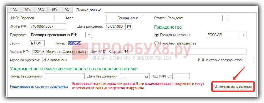 Если редактировать личные данные сотрудника в самом документе, то эти реквизиты будут выделены жирным шрифтом. Данный способ правки не рекомендован. Вернуть обратно можно нажав на кнопку «Отменить исправления»: