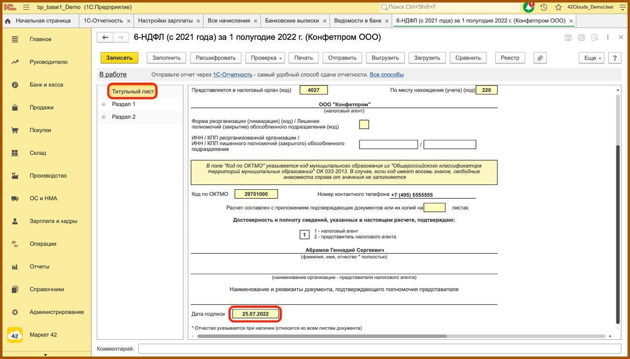 При указании июньской даты 1С посчитает, что вы не удержали налог и заполнит строку 170 автоматически, поэтому для корректного заполнения отчета мы рекомендуем ставить дату последнего дня сдачи отчетности. Либо же любую дату после проведения платежа по зарплате по банковской выписке. Например, если у вас заработная плата выплачивается 5 числа и банковская выписка проведена 5 числа, то на титульном листе нужно указать как минимум 6 число.