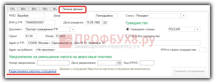 проверьте заполнения личных данных сотрудника. Если нужно отредактировать какие-либо данные, то можно перейти по гиперссылке Редактировать карточку сотрудника