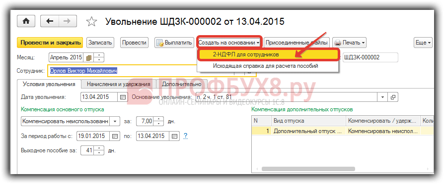 - В документе Увольнение – Создать на основании – 2-НДФЛ для сотрудников: