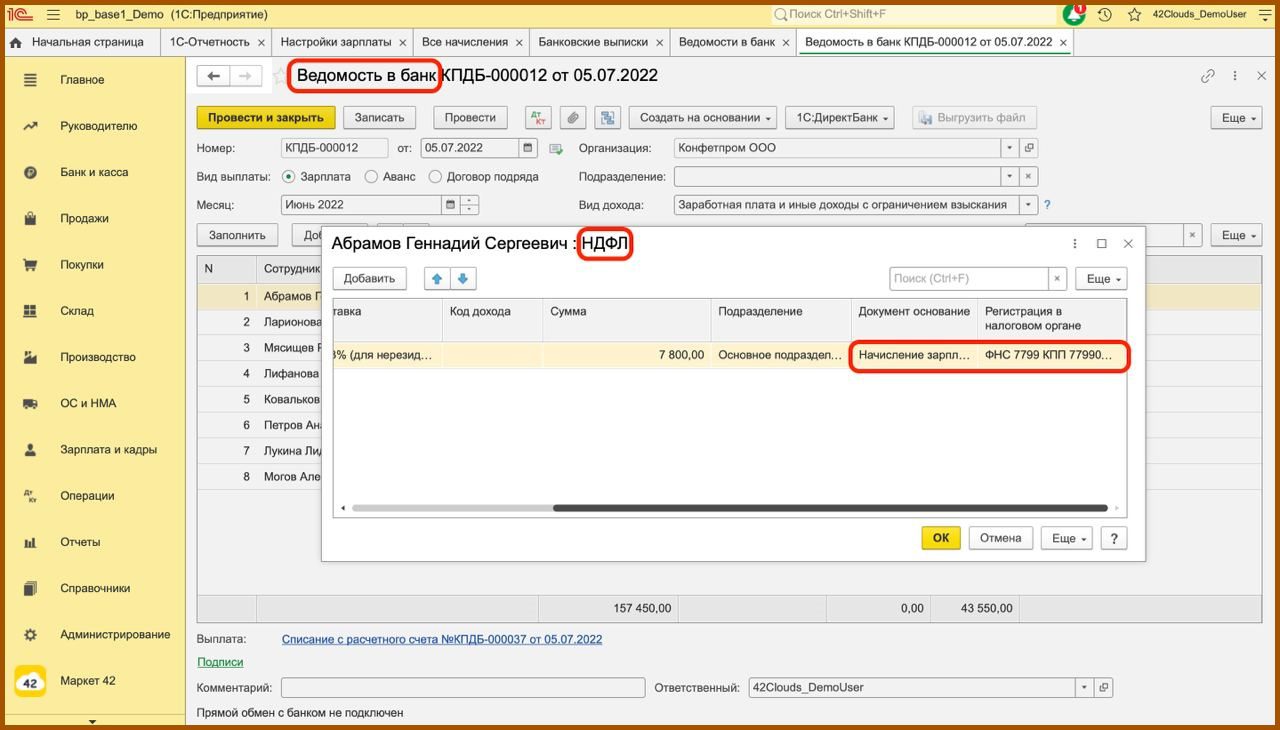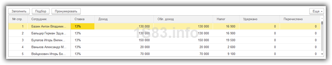 Это влияет на создание отчета, поскольку в него могут не попасть выборочные суммы. В таком случае необходимо пройтись по всем документам «Ведомость в банк» и убедиться, что по каждому сотруднику в графе «НДФЛ» стоит регистрация в налоговом органе.