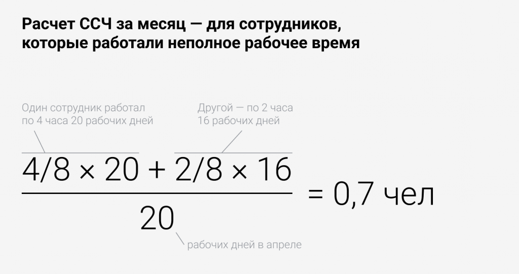 При наличии работников, занятых неполный трудовой день, ССЧ вычисляют путем сложения итоговых значений за рабочие месяцы квартала, разделенных в итоге на 3.