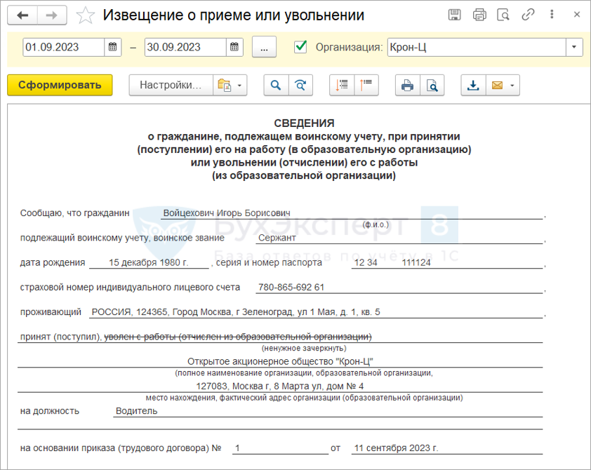 Отчет Извещение о приеме и увольнении (Кадры – Кадровые отчеты).