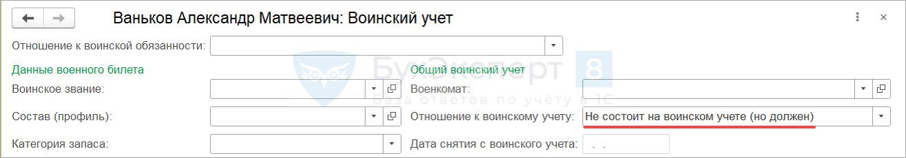 Фиксируем в ЗУП 3.1 статус работника. В сведениях о воинском учете выбираем статус Не состоит на воинском учете (но должен).