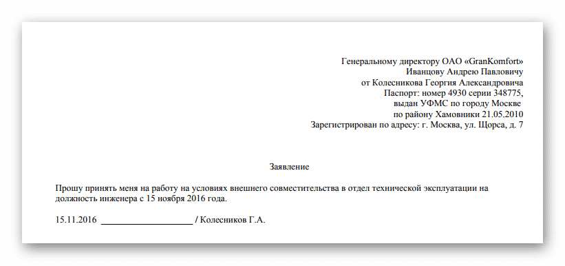 Заявление о приеме на работу на внутреннее совместительство: образец