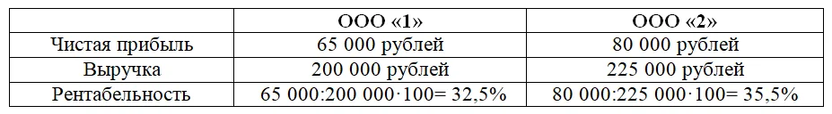 Например, ООО «1» и ООО «2» – крупные фирмы, имеют большие объемы продаж и высокую прибыль, работают в одной сфере.Для того, чтобы узнать, какое из предприятий сработало эффективнее, делают расчет рентабельности продаж:
