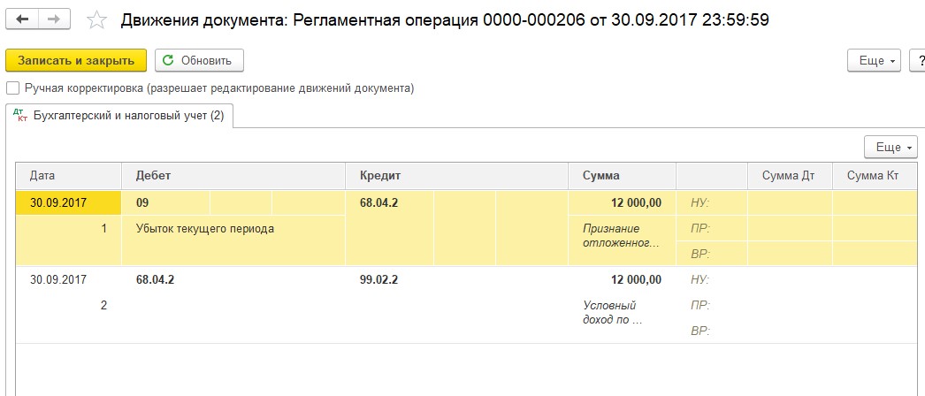| 11 | Ручные проводки по сч. 09 «Убыток текущего периода» | Ручная корректировка сч.09 по убытку текущего периода — очень странная идея. Скорее всего, такую проводку можно (и даже лучше) удалить. Правило «КонОстДт 09_УбТекПер = КонОстДт_99.01_НУ х 20%» должно соблюдаться всегда! |