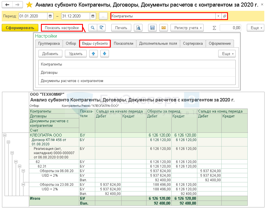 Анализ субконто — один из самых простых и понятных для анализа и контроля задолженности по контрагентам в 1С. Он позволяет провести анализ фактической задолженности по всем счетам БУ в разрезе контрагента, его договора или документа образования задолженности.