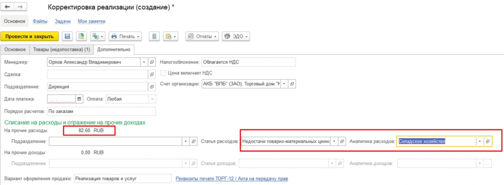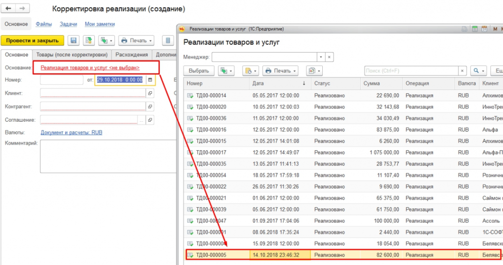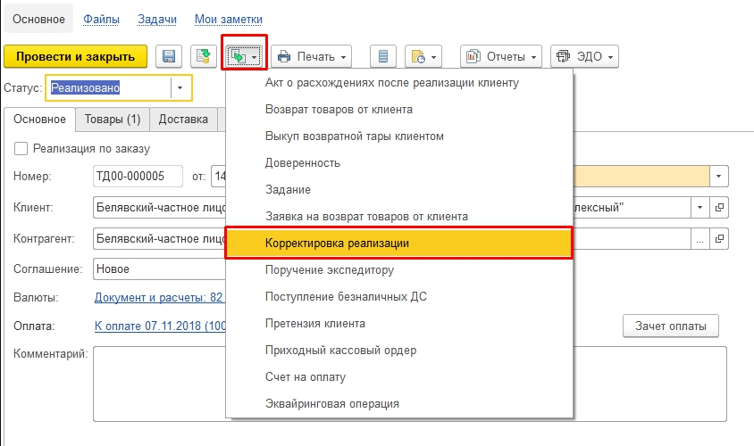 Шаг 1. Создание в 1С корректировки реализации