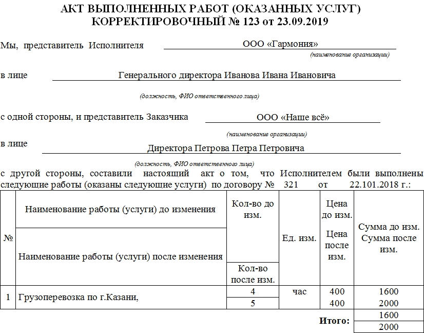 От акта выполненных работ корректировочный акт отличается названием, а также способом заполнения. Остальные же элементы документа остаются в нем неизменными.