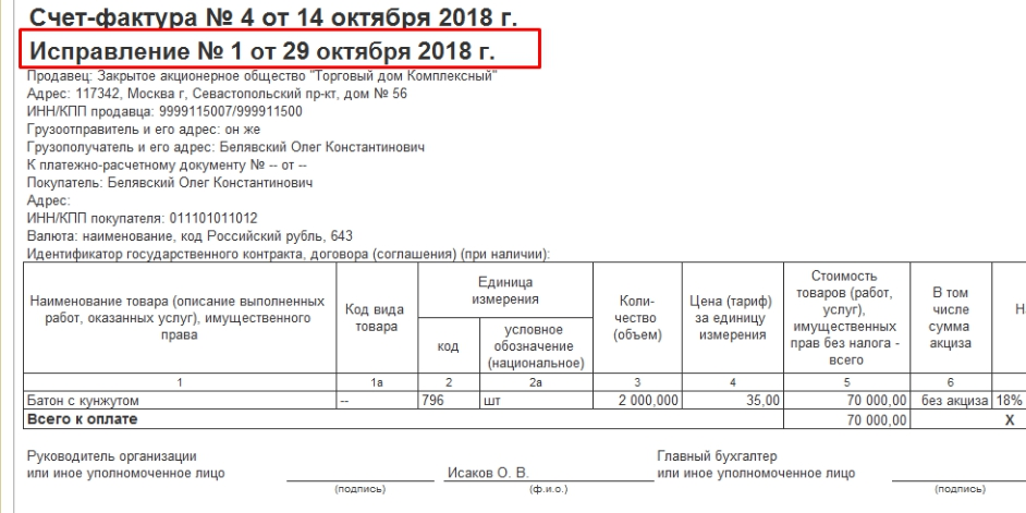 Исправительная счет фактура образец