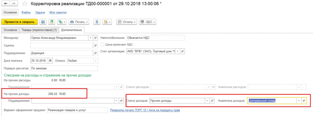 Если после совершения поставки покупатель обнаруживает лишний товар и подписывает акт расхождения, необходимо отразить этот факт в «реализации перепоставленного товара».