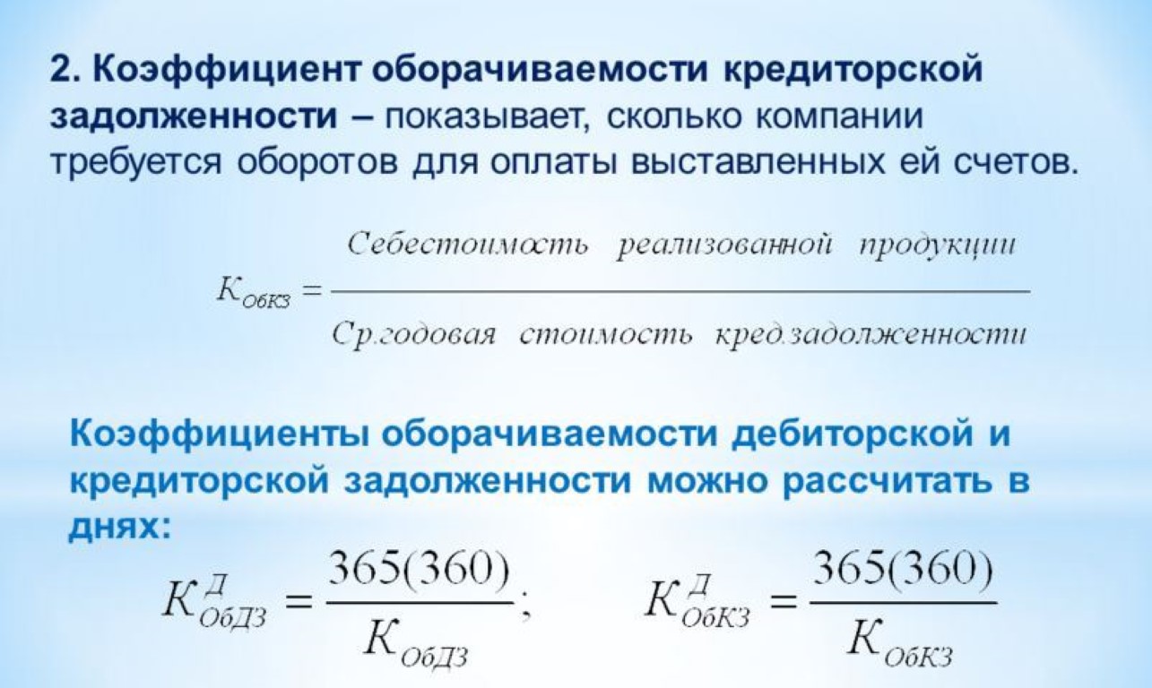 Высокий коэффициент более выгоден для кредиторов, но для самой компании лучше, чтобы он был ниже, так как остатки задолженности можно использовать в качестве дополнительных, совершенно бесплатных средств для развития.
