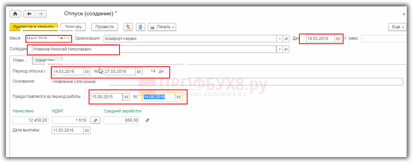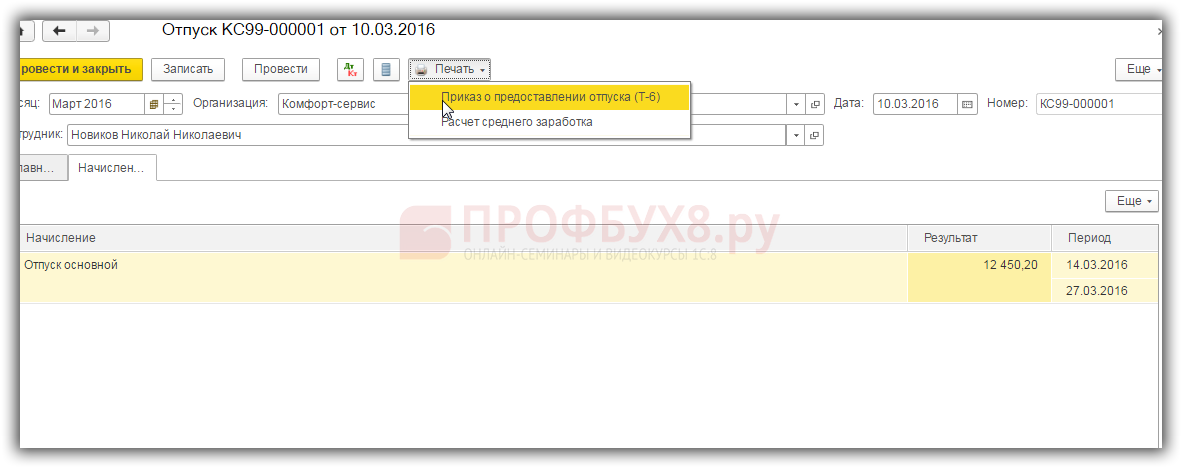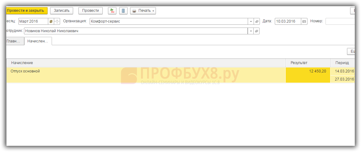 В форме расчетного документа Начисление отпуска сотрудникам организаций