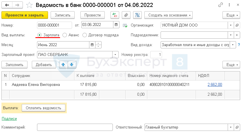 Когда из банка придет выписка банка о перечислении средств, оформите документ Списание с расчетного счета вид операции Перечисление заработной платы по ведомостям по кнопке Оплатить ведомость внизу формы документа Ведомость в банк. PDF